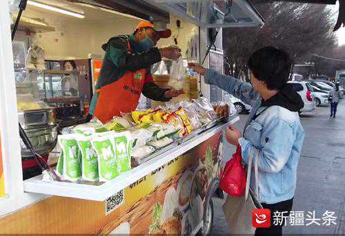 從北京來烏魯木齊市旅游的馮春麗,拉著行李箱前來購買早餐。“3月31日來到烏魯木齊,在市區里轉了兩天,今天準備去一些景區。這樣的早餐車看著簡單,其實內容豐富,昨天早上來嘗了新疆特色的馕,味道不錯。”馮春麗說:“這樣的早餐車干凈衛生,老板介紹說,餐品是公司統一配送有保障,吃著放心。我剛買了一杯小米粥和一個油香,味道不錯,粥濃稠剛好,油香不油不膩,才花了4元錢,太劃算了。”